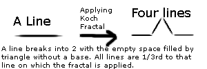 Koch Fractal is a simple algorithm which produces snowflake from a triangle. The concept behind this, is to break a line into two while leaving one third of the space between them where we fit two more lines forming an equilateral triangle without the base. This process is, then repeated to all lines again and again!