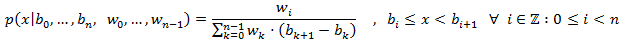 A set of n non-negative individual weights (the w's) for each of the subintervals [bi,bi+1) are set on construction. The probability of producing a value within each subinterval being their corresponding weight (wi) divided by the total of all weights.